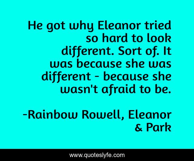 This page presents the quote "He got why Eleanor tried so hard to look different. Sort of. It was because she was different - because she wasn't afraid to be.". Author of this quote is Rainbow Rowell, Eleanor & Park. .