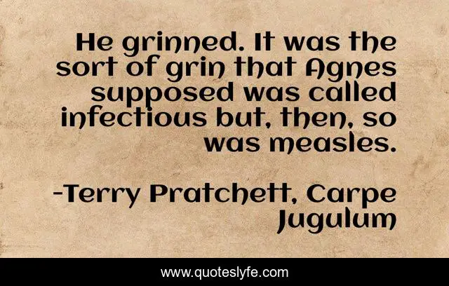 This page presents the quote "He grinned. It was the sort of grin that Agnes supposed was called infectious but, then, so was measles.". Author of this quote is Terry Pratchett, Carpe Jugulum. This quote is about infectious-diseases, measles, infectious, grin, smile, happiness,.