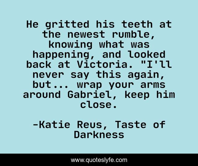 This page presents the quote "He gritted his teeth at the newest rumble, knowing what was happening, and looked back at Victoria. "I'll never say this again, but... wrap your arms around Gabriel, keep him close.". Author of this quote is Katie Reus, Taste of Darkness. This quote is about werewolves, urban-fantasy-romance, paranormal-romance, dragons,.