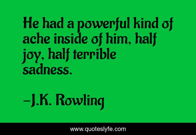 This page presents the quote "He had a powerful kind of ache inside of him, half joy, half terrible sadness.". Author of this quote is J.K. Rowling. This quote is about joy, sadness, feelings,.