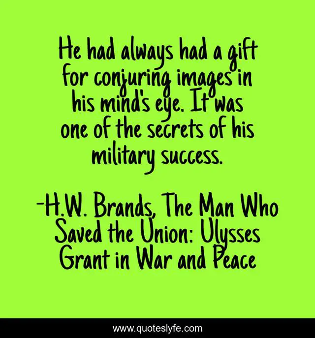 This page presents the quote "He had always had a gift for conjuring images in his mind's eye. It was one of the secrets of his military success.". Author of this quote is H.W. Brands, The Man Who Saved the Union: Ulysses Grant in War and Peace. This quote is about imagination, and-concentration, leadership, aptitude, visualization,.