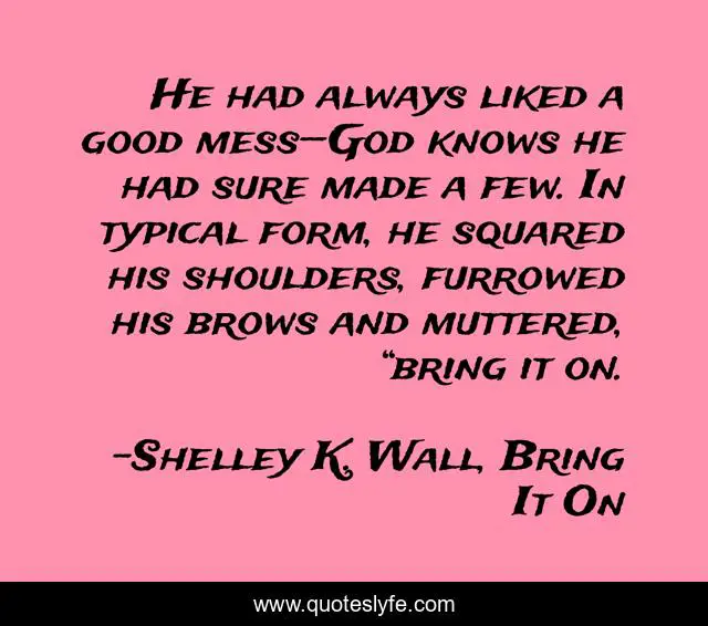 This page presents the quote "He had always liked a good mess—God knows he had sure made a few. In typical form, he squared his shoulders, furrowed his brows and muttered, “bring it on.". Author of this quote is Shelley K. Wall, Bring It On. This quote is about romance, fiction, suspense, romantic-suspense,.