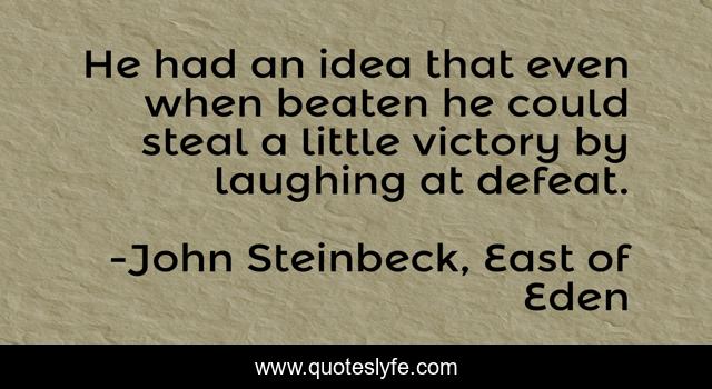This page presents the quote "He had an idea that even when beaten he could steal a little victory by laughing at defeat.". Author of this quote is John Steinbeck, East of Eden. This quote is about enthusiasm, laughter, inspirational, defeat,.