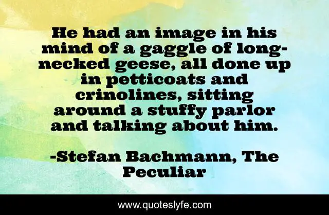 This page presents the quote "He had an image in his mind of a gaggle of long-necked geese, all done up in petticoats and crinolines, sitting around a stuffy parlor and talking about him.". Author of this quote is Stefan Bachmann, The Peculiar. This quote is about steampunk-fairy-tales, fantasy, setting, steampunk, gossip, clothes,.