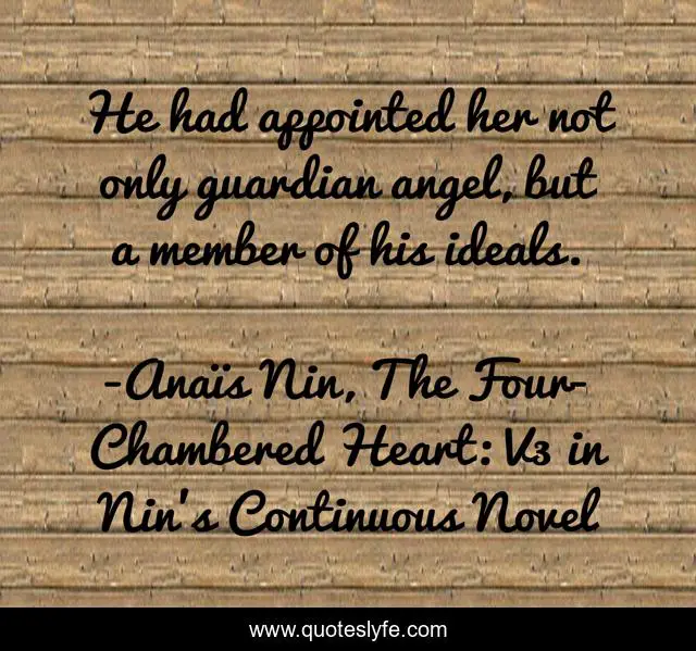 This page presents the quote "He had appointed her not only guardian angel, but a member of his ideals.". Author of this quote is Anaïs Nin, The Four-Chambered Heart: V3 in Nin's Continuous Novel. This quote is about anais-nin, books, book,.