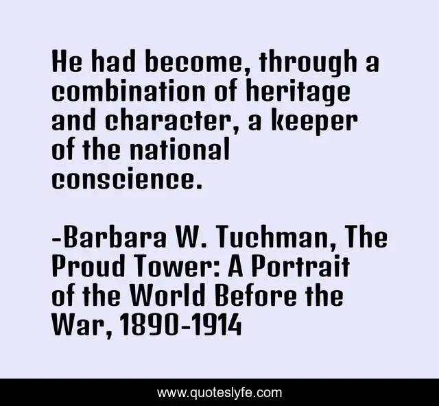 This page presents the quote "He had become, through a combination of heritage and character, a keeper of the national conscience.". Author of this quote is Barbara W. Tuchman, The Proud Tower: A Portrait of the World Before the War, 1890-1914. This quote is about statesmanship, legacy,.