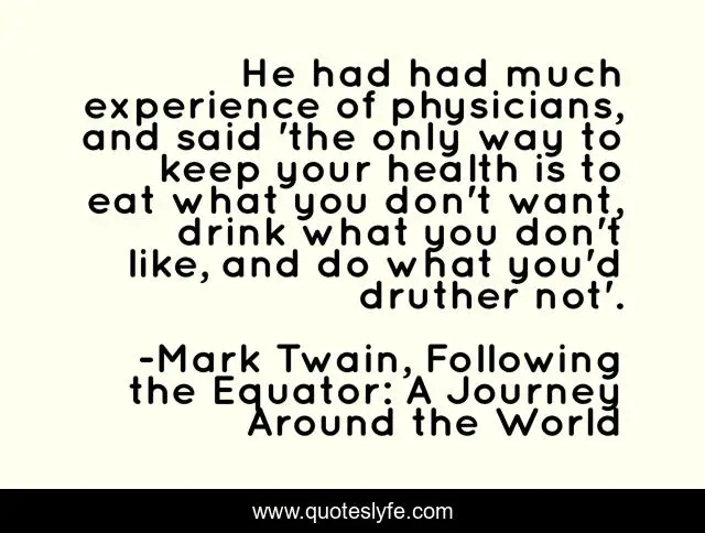 This page presents the quote "He had had much experience of physicians, and said 'the only way to keep your health is to eat what you don't want, drink what you don't like, and do what you'd druther not'.". Author of this quote is Mark Twain, Following the Equator: A Journey Around the World. This quote is about irony, wit, humor,.
