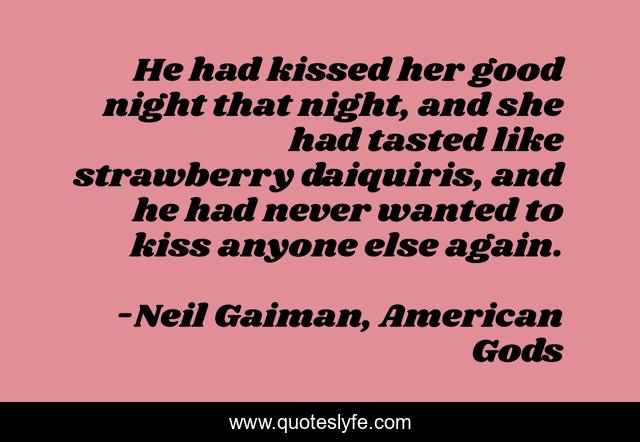 This page presents the quote "He had kissed her good night that night, and she had tasted like strawberry daiquiris, and he had never wanted to kiss anyone else again.". Author of this quote is Neil Gaiman, American Gods. This quote is about love, kiss, affection,.