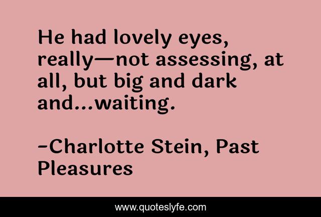 This page presents the quote "He had lovely eyes, really—not assessing, at all, but big and dark and…waiting.". Author of this quote is Charlotte Stein, Past Pleasures. .