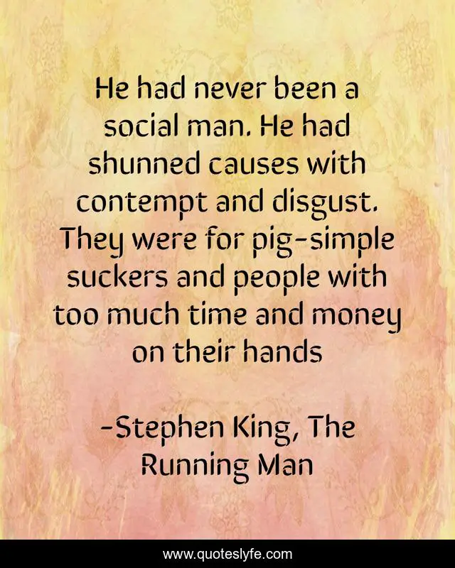 This page presents the quote "He had never been a social man. He had shunned causes with contempt and disgust. They were for pig-simple suckers and people with too much time and money on their hands". Author of this quote is Stephen King, The Running Man. This quote is about king, money, time, running, social, stephen, man,.
