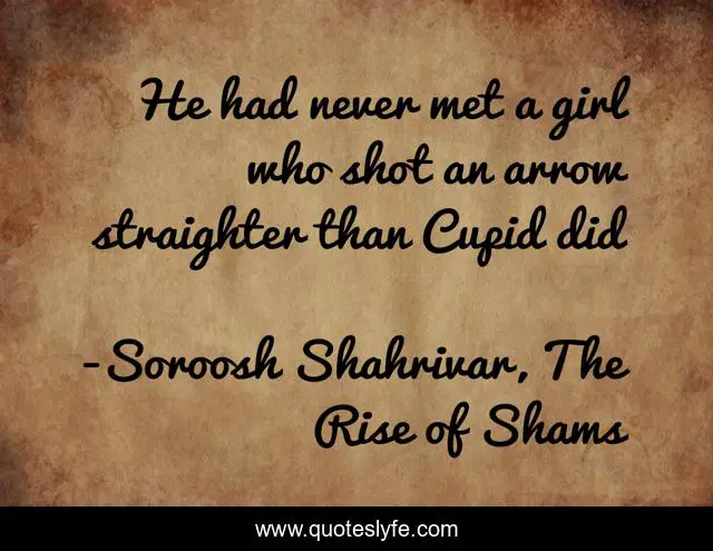 This page presents the quote "He had never met a girl who shot an arrow straighter than Cupid did". Author of this quote is Soroosh Shahrivar, The Rise of Shams. This quote is about the-rise-of-shams, girl, cupid, cupid-s-arrow,.