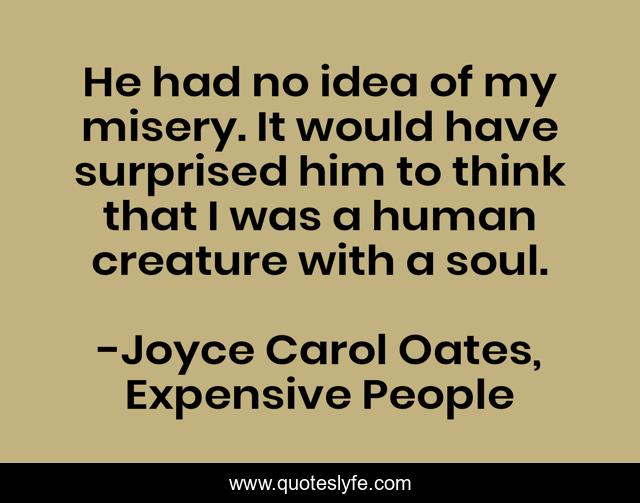 This page presents the quote "He had no idea of my misery. It would have surprised him to think that I was a human creature with a soul.". Author of this quote is Joyce Carol Oates, Expensive People. This quote is about horror, fiction,.