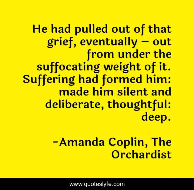 This page presents the quote "He had pulled out of that grief, eventually – out from under the suffocating weight of it. Suffering had formed him: made him silent and deliberate, thoughtful: deep.". Author of this quote is Amanda Coplin, The Orchardist. This quote is about grief, suffering, thoughtful, personality,.