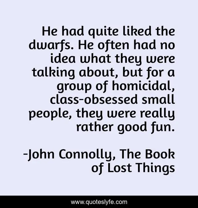 This page presents the quote "He had quite liked the dwarfs. He often had no idea what they were talking about, but for a group of homicidal, class-obsessed small people, they were really rather good fun.". Author of this quote is John Connolly, The Book of Lost Things. This quote is about fun, dwarfs,.