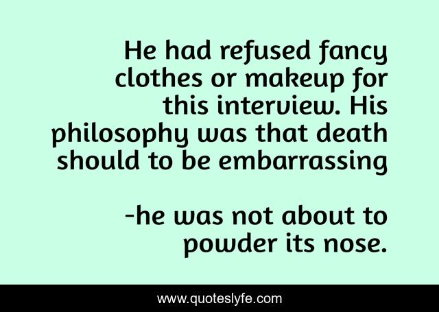This page presents the quote "He had refused fancy clothes or makeup for this interview. His philosophy was that death should to be embarrassing". Author of this quote is he was not about to powder its nose.. This quote is about tuesdays with morrie, mitch albom,.