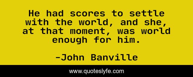 This page presents the quote "He had scores to settle with the world, and she, at that moment, was world enough for him.". Author of this quote is John Banville. .