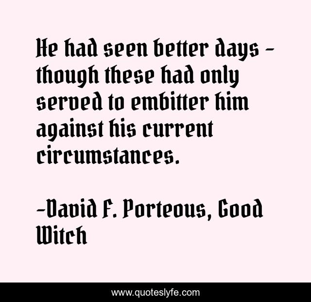 This page presents the quote "He had seen better days - though these had only served to embitter him against his current circumstances.". Author of this quote is David F. Porteous, Good Witch. This quote is about humor, better-days, experience,.