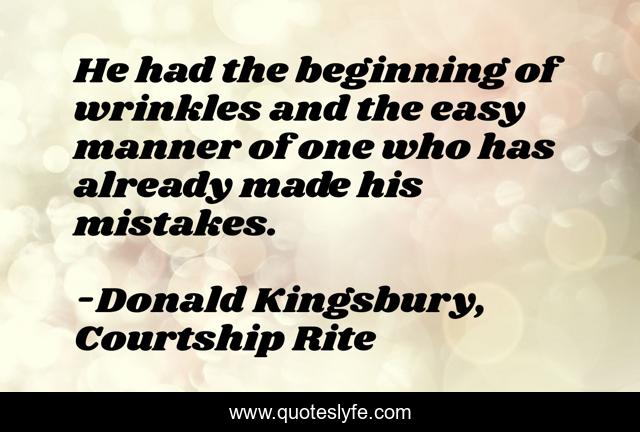 This page presents the quote "He had the beginning of wrinkles and the easy manner of one who has already made his mistakes.". Author of this quote is Donald Kingsbury, Courtship Rite. This quote is about maturity, age, description,.