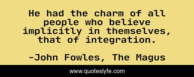This page presents the quote "He had the charm of all people who believe implicitly in themselves, that of integration.". Author of this quote is John Fowles, The Magus. This quote is about charisma, charm, confidence, integration,.