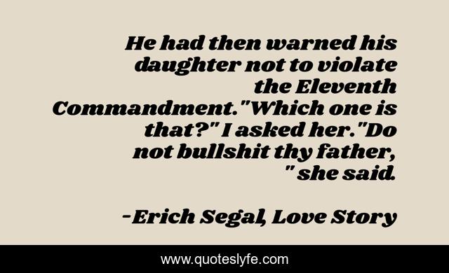 This page presents the quote "He had then warned his daughter not to violate the Eleventh Commandment."Which one is that?" I asked her."Do not bullshit thy father, " she said.". Author of this quote is Erich Segal, Love Story. This quote is about eleventh-commandment, humour,.