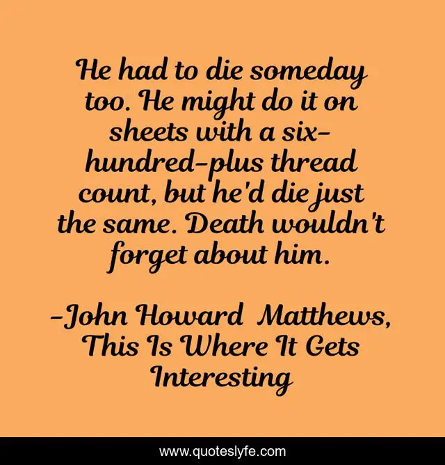 This page presents the quote "He had to die someday too. He might do it on sheets with a six-hundred-plus thread count, but he'd die just the same. Death wouldn't forget about him.". Author of this quote is John Howard Matthews, This Is Where It Gets Interesting. This quote is about america, paranormal, fiction, fantasy, short-stories, supernatural, quirky, comedy,.