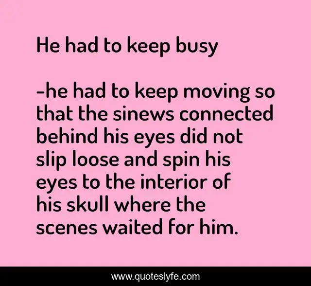 "he had to keep moving so that the sinews connected behind his eyes did not slip loose and spin his eyes to the interior of his skull where the scenes waited for him. Quotes." Quoteslyfe.com, 2025. Fri. 05 Dec. 2025. <https://www.quoteslyfe.com/quote/He-had-to-keep-busy-221943>.