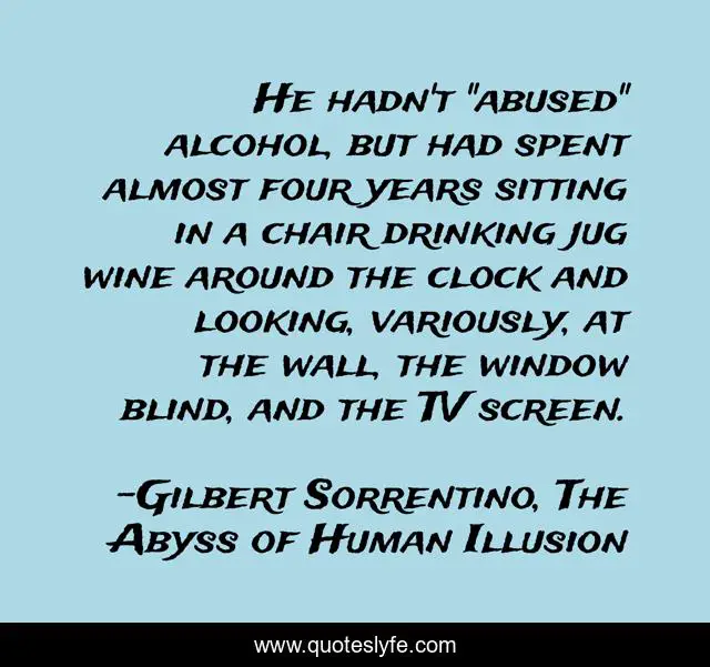 This page presents the quote "He hadn't "abused" alcohol, but had spent almost four years sitting in a chair drinking jug wine around the clock and looking, variously, at the wall, the window blind, and the TV screen.". Author of this quote is Gilbert Sorrentino, The Abyss of Human Illusion. .