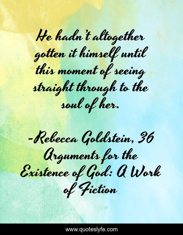 This page presents the quote "He hadn’t altogether gotten it himself until this moment of seeing straight through to the soul of her.". Author of this quote is Rebecca Goldstein, 36 Arguments for the Existence of God: A Work of Fiction. .