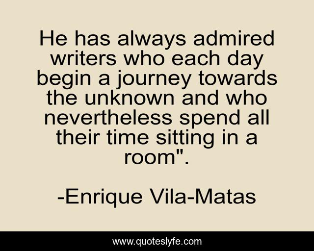 This page presents the quote "He has always admired writers who each day begin a journey towards the unknown and who nevertheless spend all their time sitting in a room".". Author of this quote is Enrique Vila-Matas. .