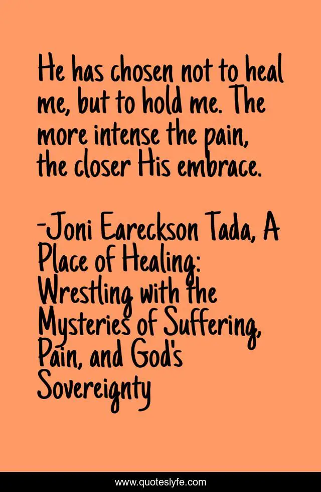 This page presents the quote "He has chosen not to heal me, but to hold me. The more intense the pain, the closer His embrace.". Author of this quote is Joni Eareckson Tada, A Place of Healing: Wrestling with the Mysteries of Suffering, Pain, and God's Sovereignty. This quote is about enthusiasm, christian, inspirational,.