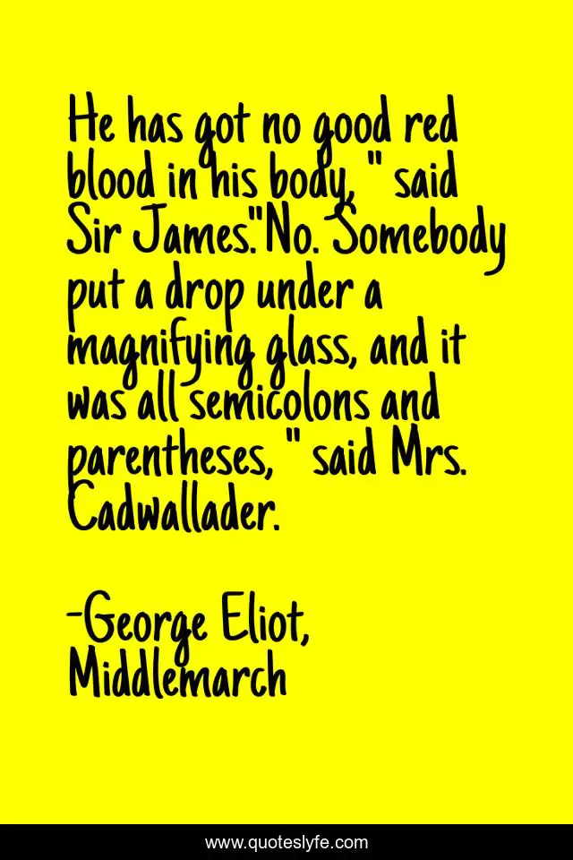 This page presents the quote "He has got no good red blood in his body, " said Sir James."No. Somebody put a drop under a magnifying glass, and it was all semicolons and parentheses, " said Mrs. Cadwallader.". Author of this quote is George Eliot, Middlemarch. This quote is about sarcasm, wit, humor, academia,.