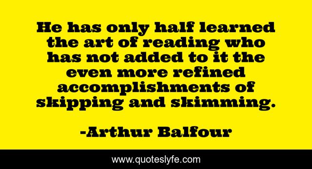 This page presents the quote "He has only half learned the art of reading who has not added to it the even more refined accomplishments of skipping and skimming.". Author of this quote is Arthur Balfour. This quote is about books, reading,.