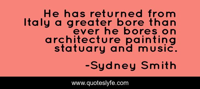 This page presents the quote "He has returned from Italy a greater bore than ever he bores on architecture painting statuary and music.". Author of this quote is Sydney Smith. This quote is about bores, boredom,.