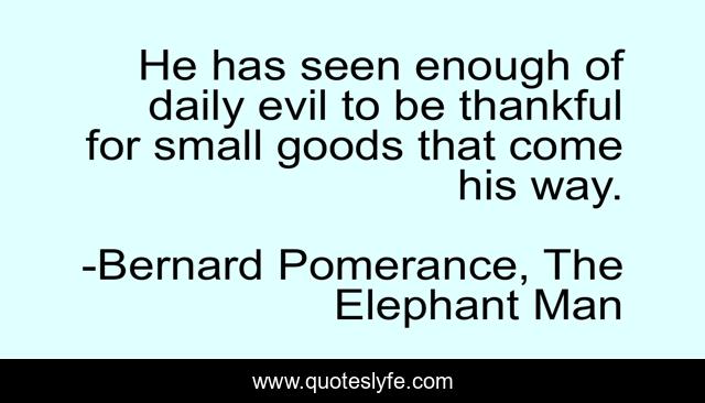 This page presents the quote "He has seen enough of daily evil to be thankful for small goods that come his way.". Author of this quote is Bernard Pomerance, The Elephant Man. This quote is about gratitude, society, human-cruelty, evil, people,.