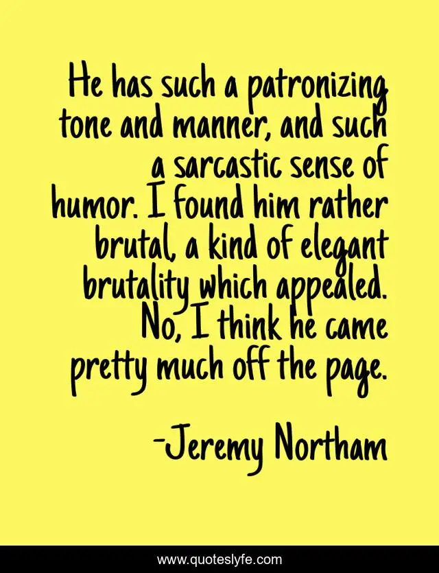 This page presents the quote "He has such a patronizing tone and manner, and such a sarcastic sense of humor. I found him rather brutal, a kind of elegant brutality which appealed. No, I think he came pretty much off the page.". Author of this quote is Jeremy Northam. This quote is about think, sarcastic, page,.