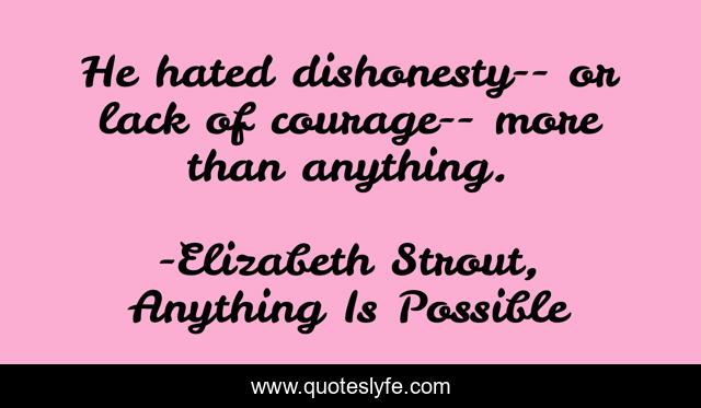 This page presents the quote "He hated dishonesty-- or lack of courage-- more than anything.". Author of this quote is Elizabeth Strout, Anything Is Possible. This quote is about courage, honesty, truth,.
