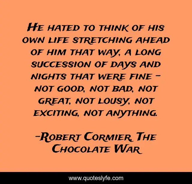 This page presents the quote "He hated to think of his own life stretching ahead of him that way, a long succession of days and nights that were fine - not good, not bad, not great, not lousy, not exciting, not anything.". Author of this quote is Robert Cormier, The Chocolate War. This quote is about boring, life, mediocre,.