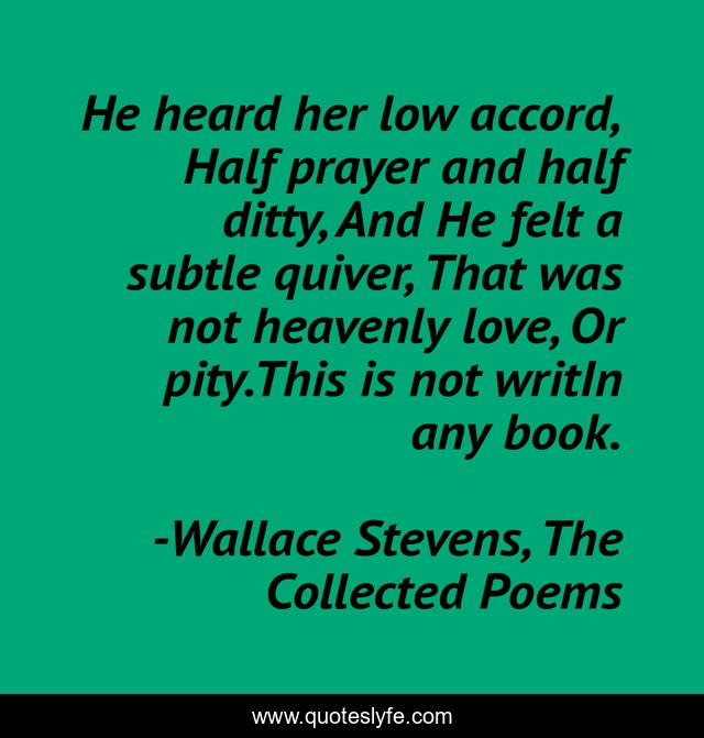 This page presents the quote "He heard her low accord, Half prayer and half ditty, And He felt a subtle quiver, That was not heavenly love, Or pity.This is not writIn any book.". Author of this quote is Wallace Stevens, The Collected Poems. This quote is about god, prayer,.