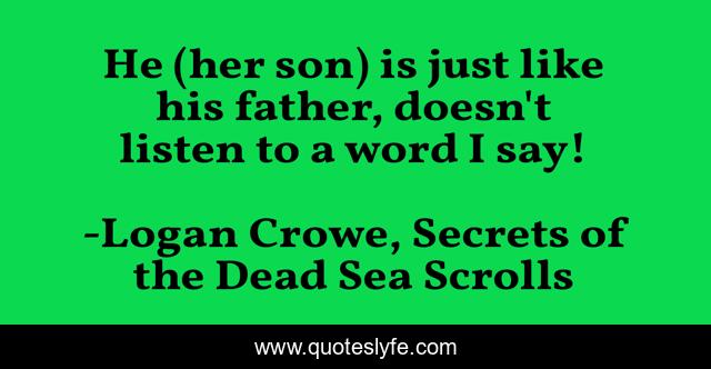 This page presents the quote "He (her son) is just like his father, doesn't listen to a word I say!". Author of this quote is Logan Crowe, Secrets of the Dead Sea Scrolls. This quote is about israel, bible, biblical-fiction, qumran, religion, deadsea-scrolls, dead-sea, judea, historical-fiction,.