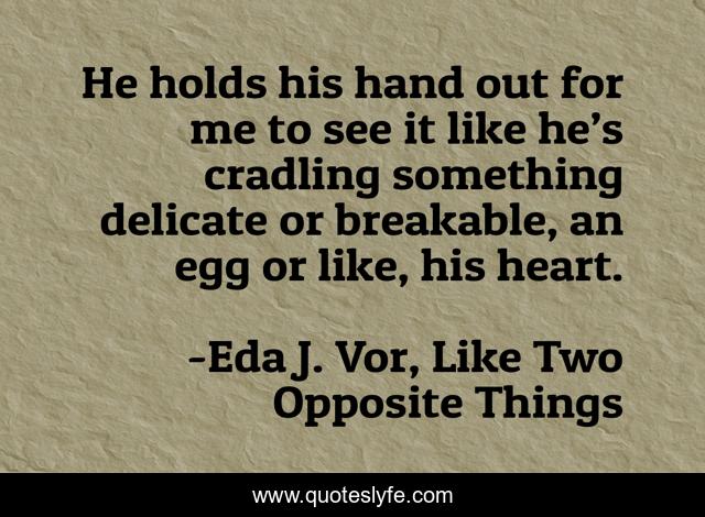 This page presents the quote "He holds his hand out for me to see it like he’s cradling something delicate or breakable, an egg or like, his heart.". Author of this quote is Eda J. Vor, Like Two Opposite Things. This quote is about broken-heart, vulnerability, teen-love,.