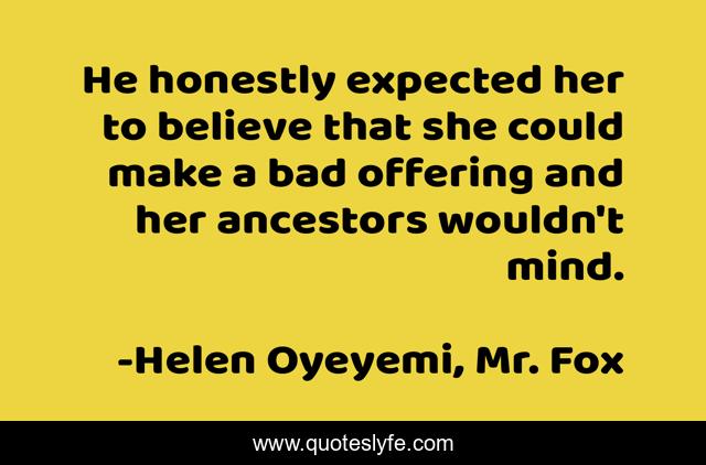 This page presents the quote "He honestly expected her to believe that she could make a bad offering and her ancestors wouldn't mind.". Author of this quote is Helen Oyeyemi, Mr. Fox. This quote is about ancestors, offering, writing,.