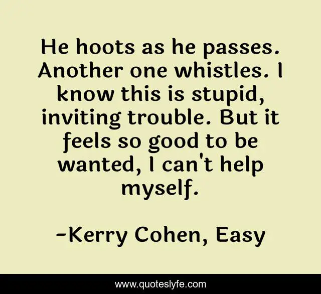 This page presents the quote "He hoots as he passes. Another one whistles. I know this is stupid, inviting trouble. But it feels so good to be wanted, I can't help myself.". Author of this quote is Kerry Cohen, Easy. This quote is about young-adult, ya-saves,.