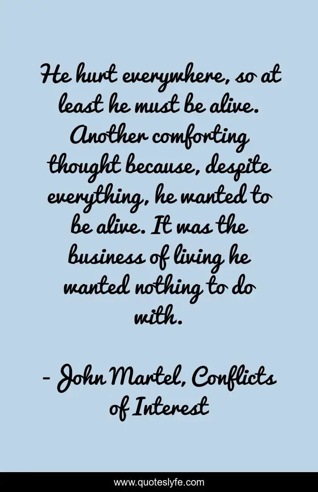 This page presents the quote "He hurt everywhere, so at least he must be alive. Another comforting thought because, despite everything, he wanted to be alive. It was the business of living he wanted nothing to do with.". Author of this quote is John Martel, Conflicts of Interest. This quote is about seth-cameron, living, life, pain, alive,.
