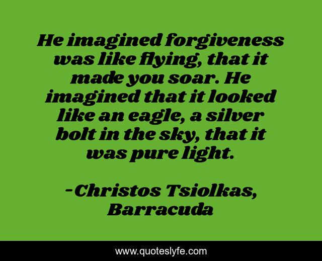 This page presents the quote "He imagined forgiveness was like flying, that it made you soar. He imagined that it looked like an eagle, a silver bolt in the sky, that it was pure light.". Author of this quote is Christos Tsiolkas, Barracuda. .
