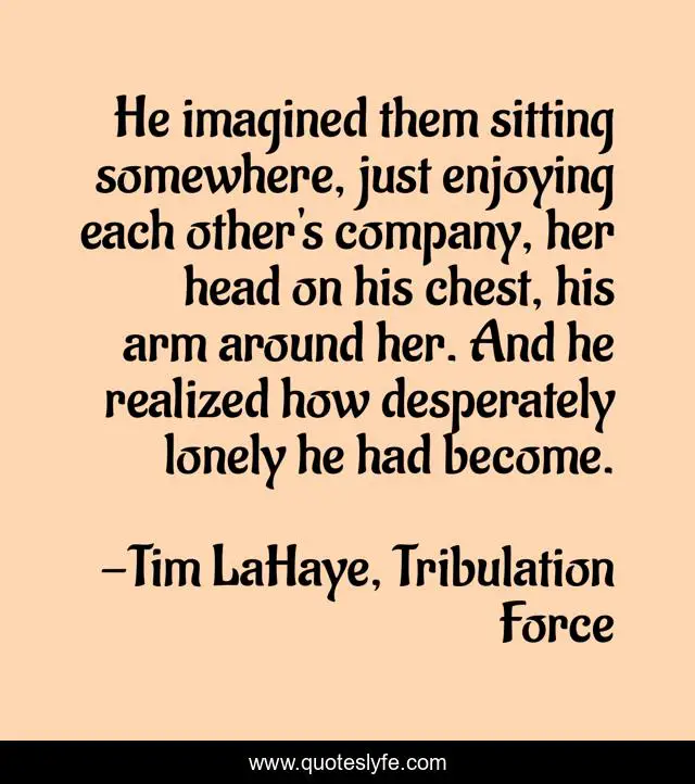This page presents the quote "He imagined them sitting somewhere, just enjoying each other's company, her head on his chest, his arm around her. And he realized how desperately lonely he had become.". Author of this quote is Tim LaHaye, Tribulation Force. This quote is about wish, cuddle, love, lonley, affection,.