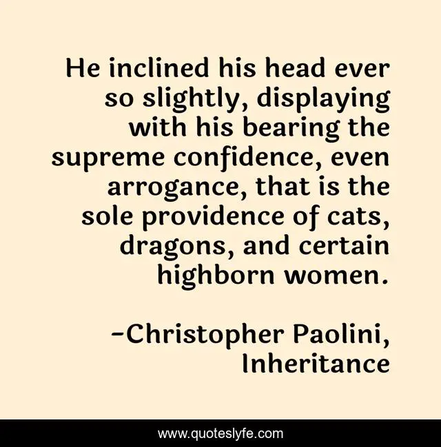 This page presents the quote "He inclined his head ever so slightly, displaying with his bearing the supreme confidence, even arrogance, that is the sole providence of cats, dragons, and certain highborn women.". Author of this quote is Christopher Paolini, Inheritance. This quote is about bearing, confidence, arrogance, demeanor, cats, ladyship,.