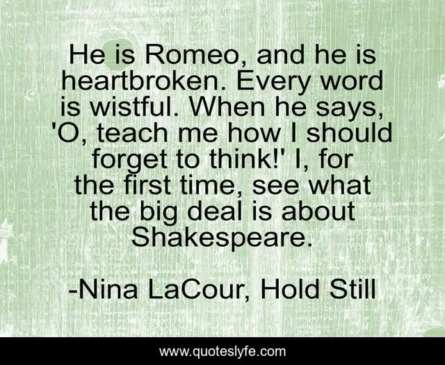 This page presents the quote "He is Romeo, and he is heartbroken. Every word is wistful. When he says, 'O, teach me how I should forget to think!' I, for the first time, see what the big deal is about Shakespeare.". Author of this quote is Nina LaCour, Hold Still. This quote is about nina-lacour, hold-still, romeo-and-juliet, pain, shakespeare,.