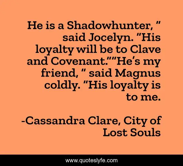 This page presents the quote "He is a Shadowhunter, ” said Jocelyn. “His loyalty will be to Clave and Covenant.”“He’s my friend, ” said Magnus coldly. “His loyalty is to me.". Author of this quote is Cassandra Clare, City of Lost Souls. This quote is about magnus-bane, city-of-lost-souls, loyalty,.