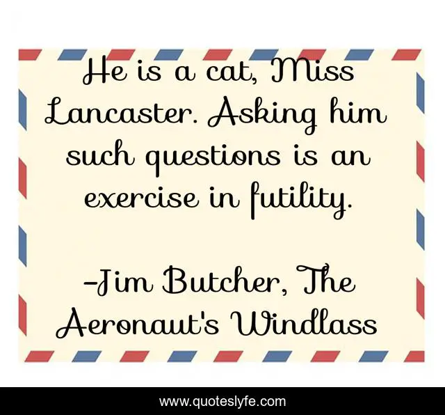 This page presents the quote "He is a cat, Miss Lancaster. Asking him such questions is an exercise in futility.". Author of this quote is Jim Butcher, The Aeronaut's Windlass. .