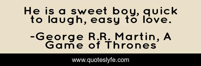 This page presents the quote "He is a sweet boy, quick to laugh, easy to love.". Author of this quote is George R.R. Martin, A Game of Thrones. This quote is about boy, humor, easy, sweet, laugh, love, affection, romantic,.